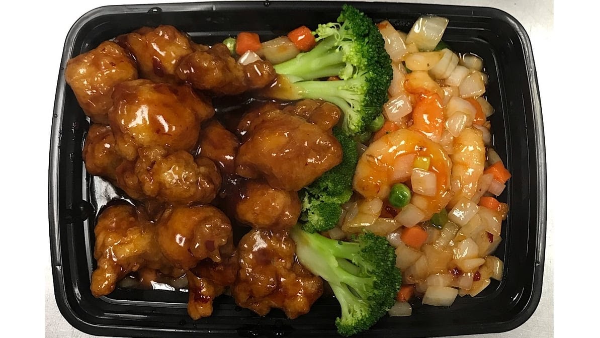 Jumbo shrimp, beef chicken, broccoli with mix veg.